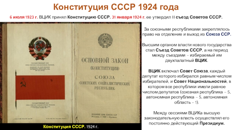 6 июля 1923 г. ВЦИК принял Конституцию СССР. 31 января 1924 г. ее утвердил II съезд Советов СССР.