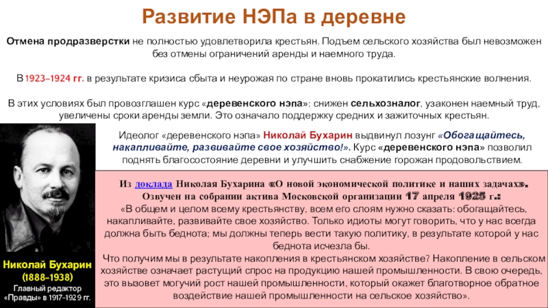«В общем и целом всему крестьянству, всем его слоям нужно сказать: обогащайтесь, накапливайте, развивайте свое хозяйство. Только идиоты могут говорить, что у нас всегда должна быть беднота; мы должны теперь вести такую политику, в результате которой у нас беднота исчезла бы.