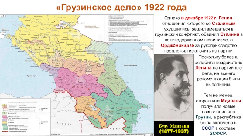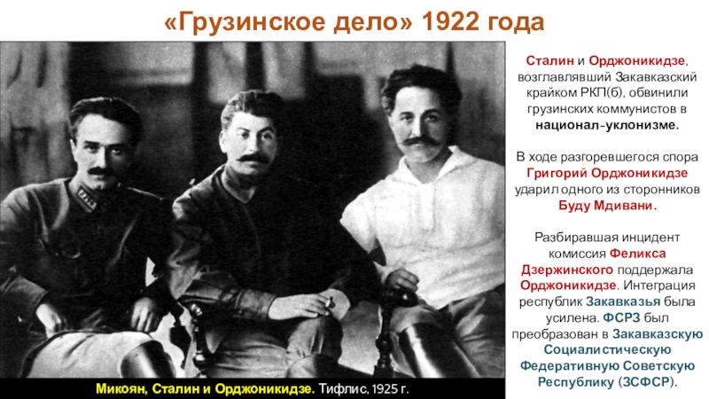 Однако в декабре 1922 г. Ленин, отношения которого со Сталиным ухудшились, решил вмешаться в грузинский конфликт, обвинил Сталина в великодержавном шовинизме, а Орджоникидзе за рукоприкладство предложил исключить из партии.