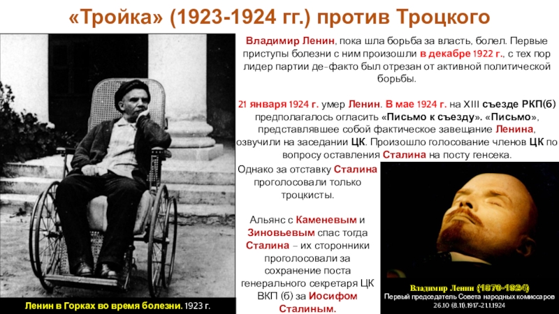 Владимир Ленин, пока шла борьба за власть, болел. Первые приступы болезни с ним произошли в декабре 1922 г., с тех пор лидер партии де-факто был отрезан от активной политической борьбы.