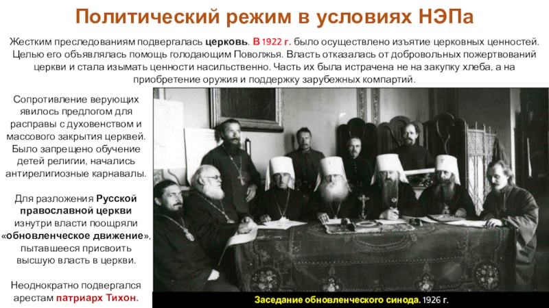 Жестким преследованиям подвергалась церковь. В 1922 г. было осуществлено изъятие церковных ценностей. Целью его объявлялась помощь голодающим Поволжья. Власть отказалась от добровольных пожертвований церкви и стала изымать ценности насильственно. Часть их была истрачена не на закупку хлеба, а на приобретение оружия и поддержку зарубежных компартий.