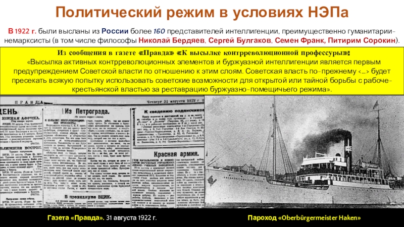 В 1922 г. были высланы из России более 160 представителей интеллигенции, преимущественно гуманитарии-немарксисты (в том числе философы Николай Бердяев, Сергей Булгаков, Семен Франк, Питирим Сорокин).