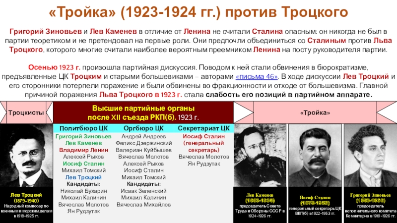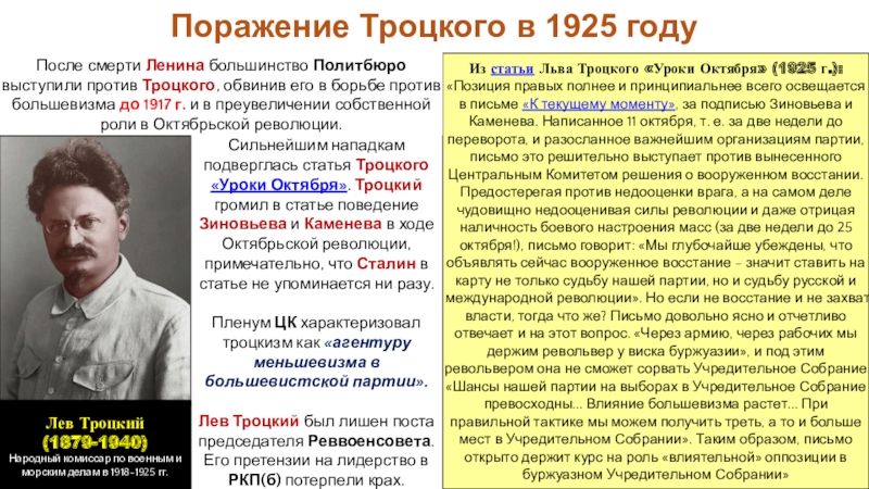 После смерти Ленина большинство Политбюро выступили против Троцкого, обвинив его в борьбе против большевизма до 1917 г. и в преувеличении собственной роли в Октябрьской революции.