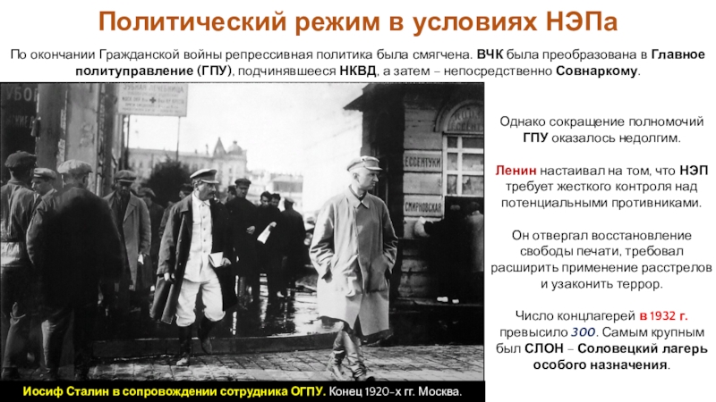 По окончании Гражданской войны репрессивная политика была смягчена. ВЧК была преобразована в Главное политуправление (ГПУ), подчинявшееся НКВД, а затем – непосредственно Совнаркому.