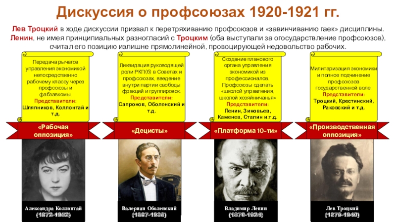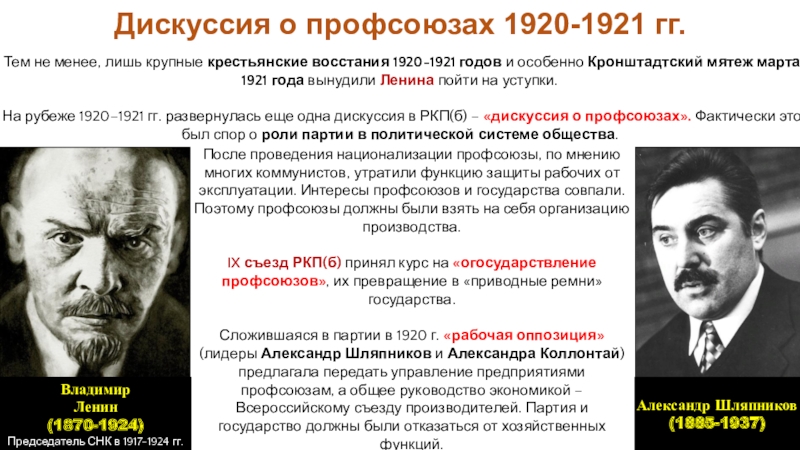 На рубеже 1920–1921 гг. развернулась еще одна дискуссия в РКП(б) – «дискуссия о профсоюзах». Фактически это был спор о роли партии в политической системе общества.