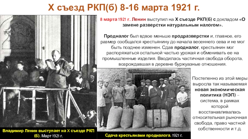 8 марта 1921 г. Ленин выступил на Х съезде РКП(б) с докладом «О замене разверстки натуральным налогом».