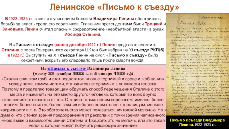 21 января 1924 г. умер Ленин. В мае 1924 г. на XIII съезде РКП(б) предполагалось огласить «Письмо к съезду». «Письмо», представлявшее собой фактическое завещание Ленина, озвучили на заседании ЦК. Произошло голосование членов ЦК по вопросу оставления Сталина на посту генсека.