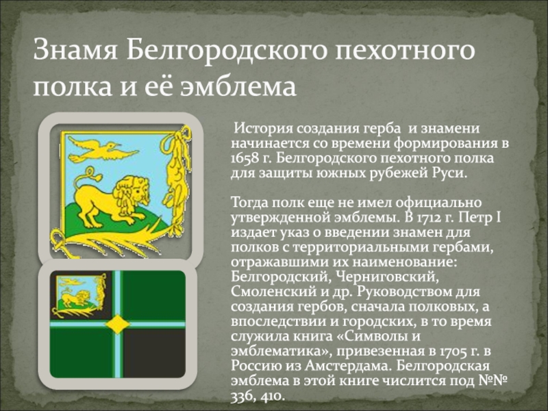 Тогда полк еще не имел официально утвержденной эмблемы. В 1712 г. Петр I издает указ о введении знамен для полков с территориальными гербами, отражавшими их наименование: Белгородский, Черниговский, Смоленский и др. Руководством для создания гербов, сначала полковых, а впоследствии и городских, в то время служила книга «Символы и эмблематика», привезенная в 1705 г. в Россию из Амстердама. Белгородская эмблема в этой книге числится под №№ 336, 410.