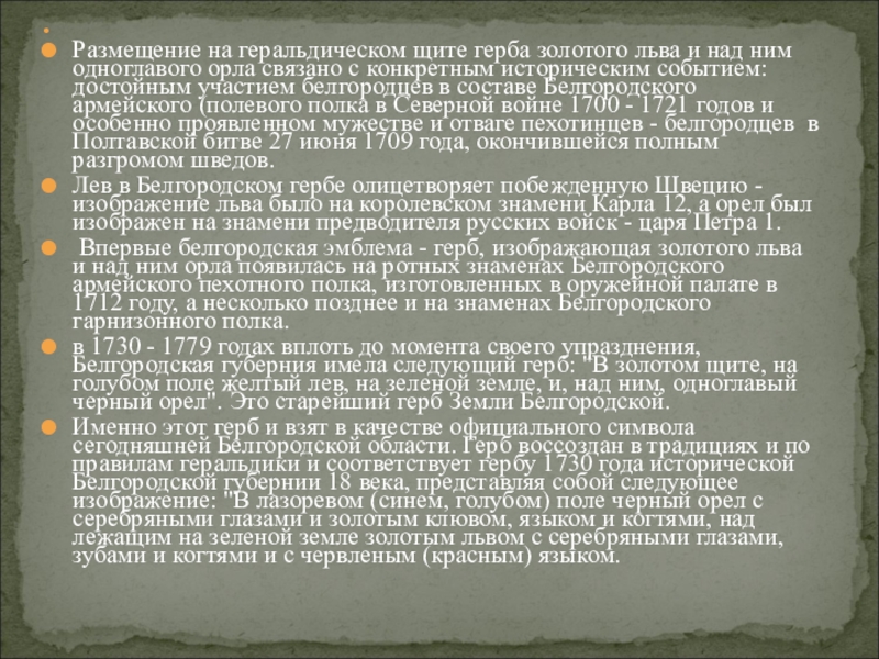 в 1730 - 1779 годах вплоть до момента своего упразднения, Белгородская губерния имела следующий герб: "В золотом щите, на голубом поле желтый лев, на зеленой земле, и, над ним, одноглавый черный орел". Это старейший герб Земли Белгородской.