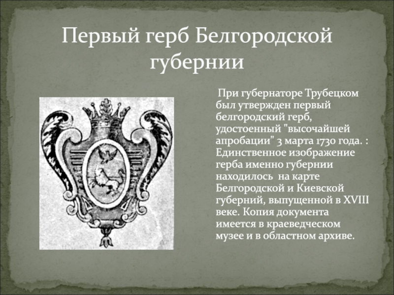Слайд 13 Герб Белгородской губернии XVIII век с карты Белгородской