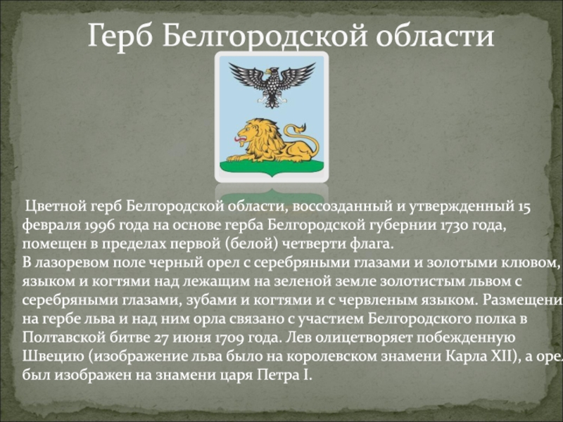 Лев в Белгородском гербе олицетворяет побежденную Швецию - изображение льва было на королевском знамени Карла 12, а орел был изображен на знамени предводителя русских войск - царя Петра 1.