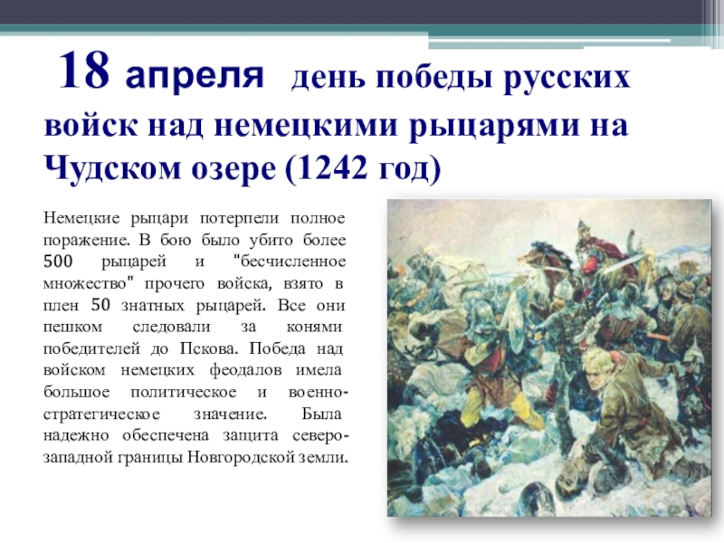 Немецкие рыцари потерпели полное поражение. В бою было убито более 500 рыцарей и "бесчисленное множество" прочего войска, взято в плен 50 знатных рыцарей. Все они пешком следовали за конями победителей до Пскова. Победа над войском немецких феодалов имела большое политическое и военно-стратегическое значение. Была надежно обеспечена защита северо-западной границы Новгородской земли.