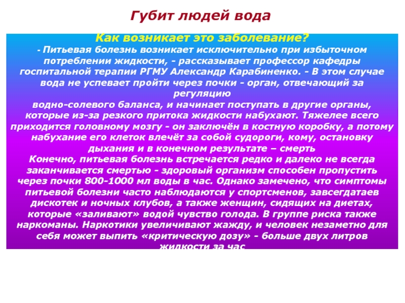 смерти стала водная интоксикация, или питьевая болезнь. Так врачи
