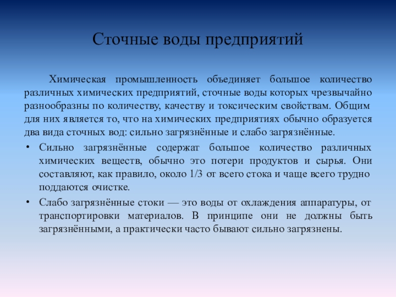 и токсическим свойствам. Общим для них является то, что на химических предприятиях обычно образуется два вида сточных вод: сильно загрязнённые и слабо загрязнённые.
