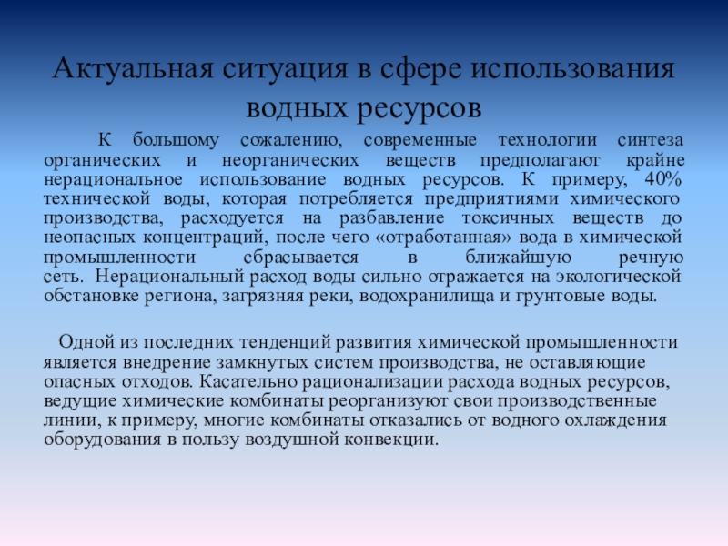 нерациональное использование водных ресурсов. К примеру, 40% технической воды, которая потребляется предприятиями химического производства, расходуется на разбавление токсичных веществ до неопасных концентраций, после чего «отработанная» вода в химической промышленности сбрасывается в ближайшую речную сеть. Нерациональный расход воды сильно отражается на экологической обстановке региона, загрязняя реки, водохранилища и грунтовые воды.