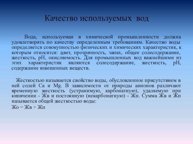 Жесткостью называется свойство воды, обусловленное присутствием в ней солей Са и Мg. В зависимости от природы анионов различают временную жесткость (устранимую, карбонатную), удаляемую при кипячении - Жв и постоянную (некарбонатную) - Жп. Сумма Жв и Жп называется общей жесткостью воды:
