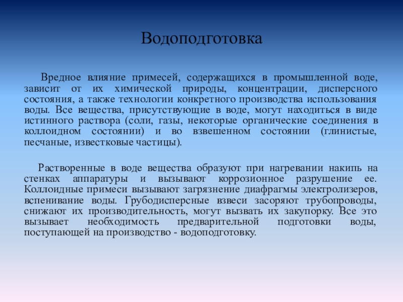 Растворенные в воде вещества образуют при нагревании накипь на стенках аппаратуры и вызывают коррозионное разрушение ее. Коллоидные примеси вызывают загрязнение диафрагмы электролизеров, вспенивание воды. Грубодисперсные взвеси засоряют трубопроводы, снижают их производительность, могут вызвать их закупорку. Все это вызывает необходимость предварительной подготовки воды, поступающей на производство - водоподготовку.