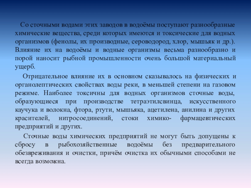 организмов (фенолы, их производные, сероводород, хлор, мышьяк и др.). Влияние их на водоёмы и водные организмы весьма разнообразно и порой наносит рыбной промышленности очень большой материальный ущерб.