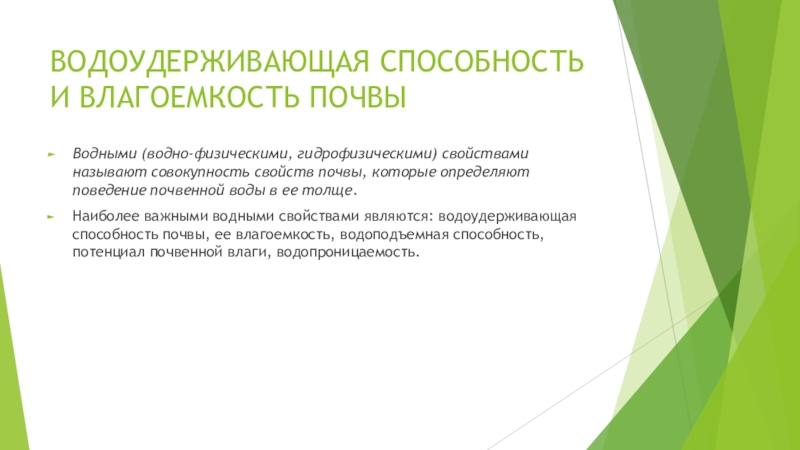 Слайд 14ВОДОУДЕРЖИВАЮЩАЯ СПОСОБНОСТЬ И ВЛАГОЕМКОСТЬ ПОЧВЫ