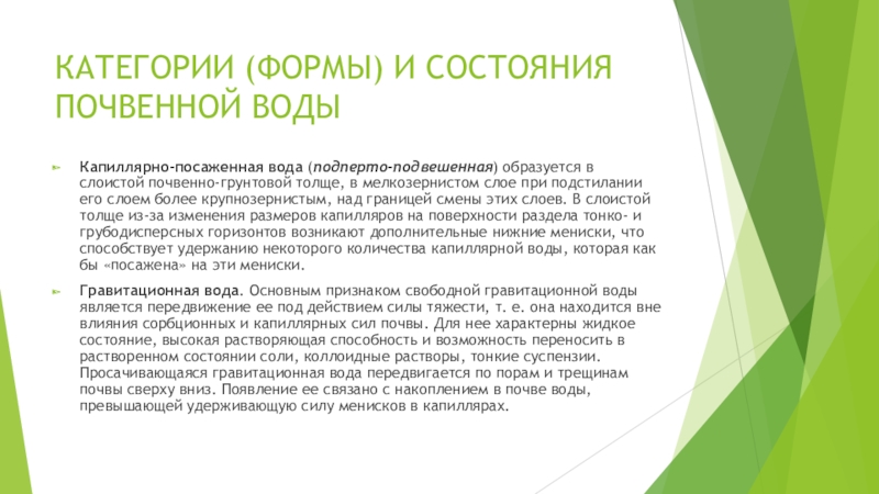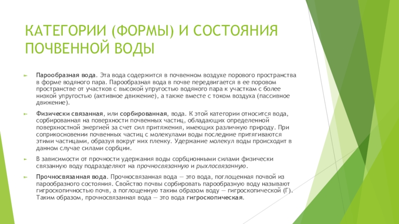 Слайд 8КАТЕГОРИИ (ФОРМЫ) И СОСТОЯНИЯ ПОЧВЕННОЙ ВОДЫ