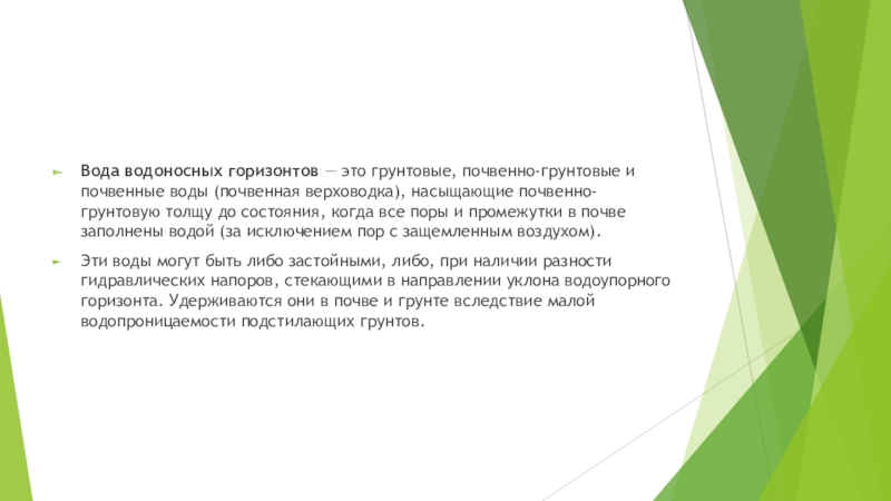 Слайд 10Вода водоносных горизонтов — это грунтовые, почвенно-грунтовые и почвенные воды (почвенная