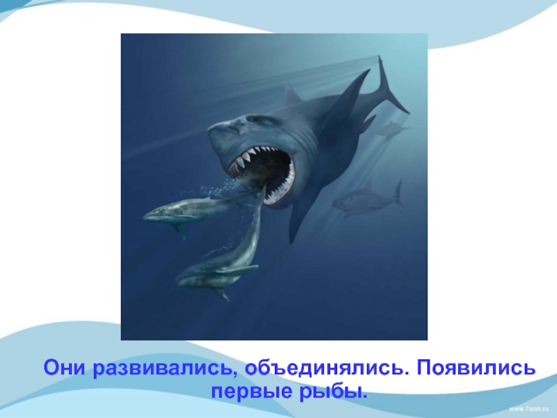 Слайд 8Они развивались, объединялись. Появились первые рыбы.