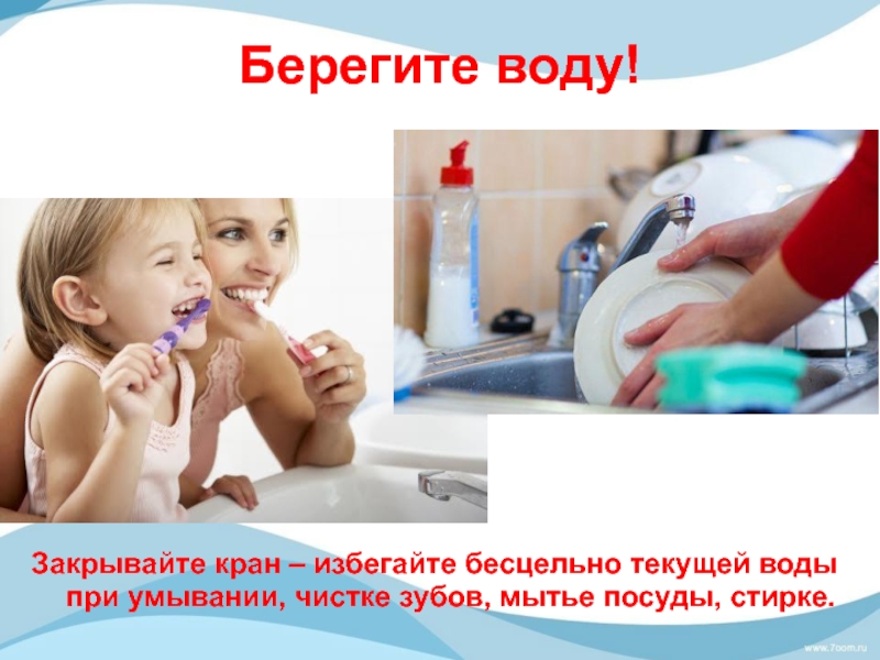 Берегите воду!Закрывайте кран – избегайте бесцельно текущей воды при умывании, чистке зубов, мытье посуды, стирке.