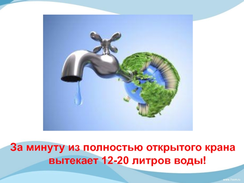 Слайд 35За минуту из полностью открытого крана вытекает 12-20 литров воды!