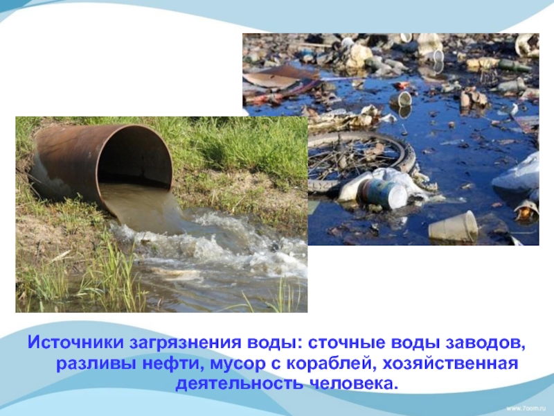 Слайд 32Источники загрязнения воды: сточные воды заводов, разливы нефти, мусор с