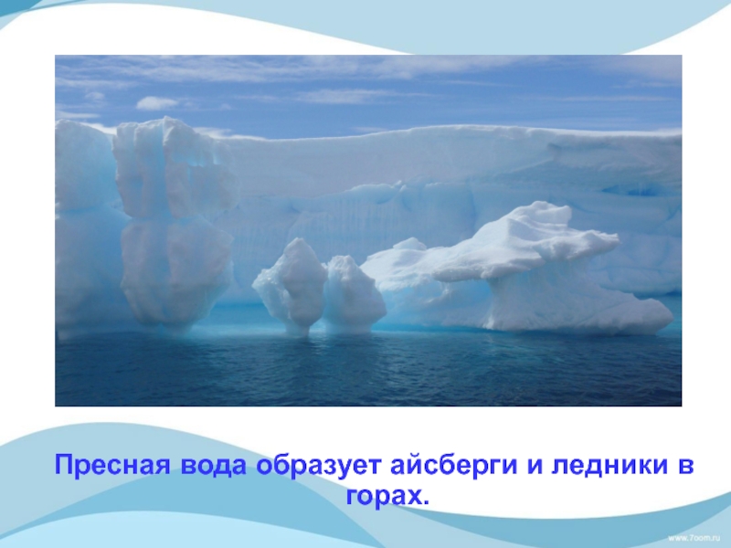 Слайд 16Пресная вода образует айсберги и ледники в горах.