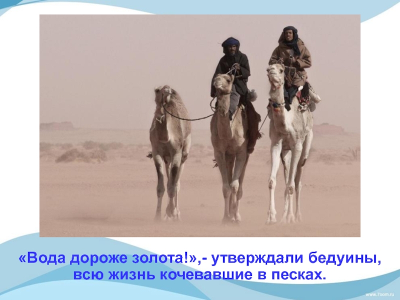 Слайд 30«Вода дороже золота!»,- утверждали бедуины, всю жизнь кочевавшие в песках.
