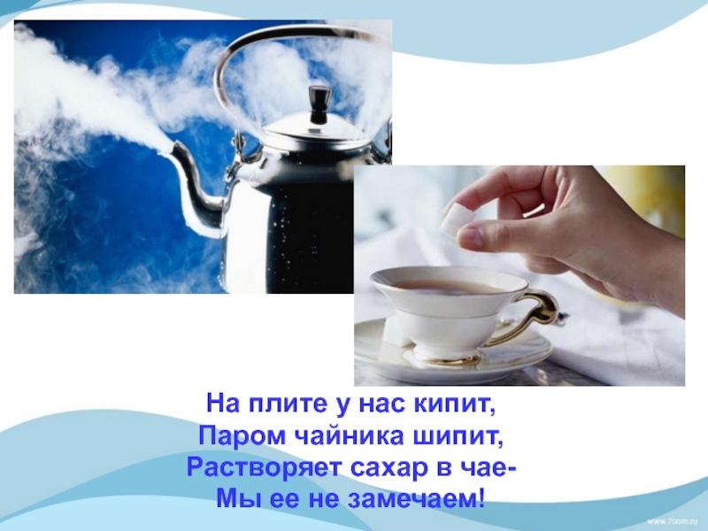 На плите у нас кипит, Паром чайника шипит,Растворяет сахар в чае-Мы ее не замечаем!
