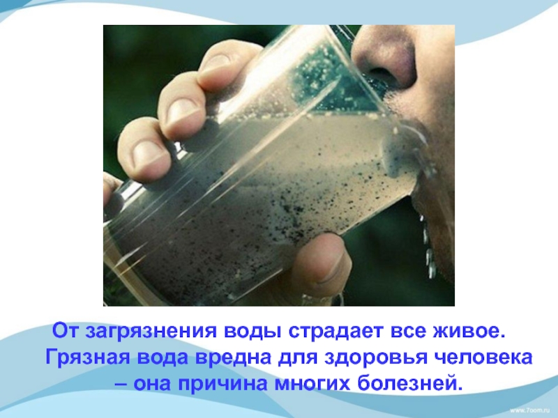 От загрязнения воды страдает все живое. Грязная вода вредна для здоровья человека – она причина многих болезней.