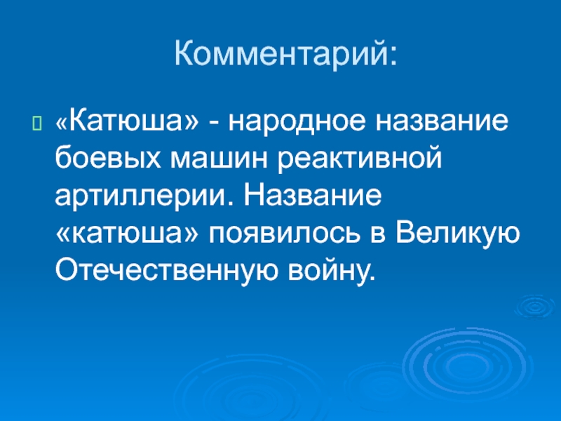 «Катюша» - народное название боевых машин реактивной артиллерии. Название «катюша»
