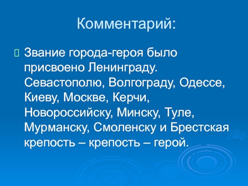 Звание города-героя было присвоено Ленинграду. Севастополю, Волгограду, Одессе, Киеву, Москве,