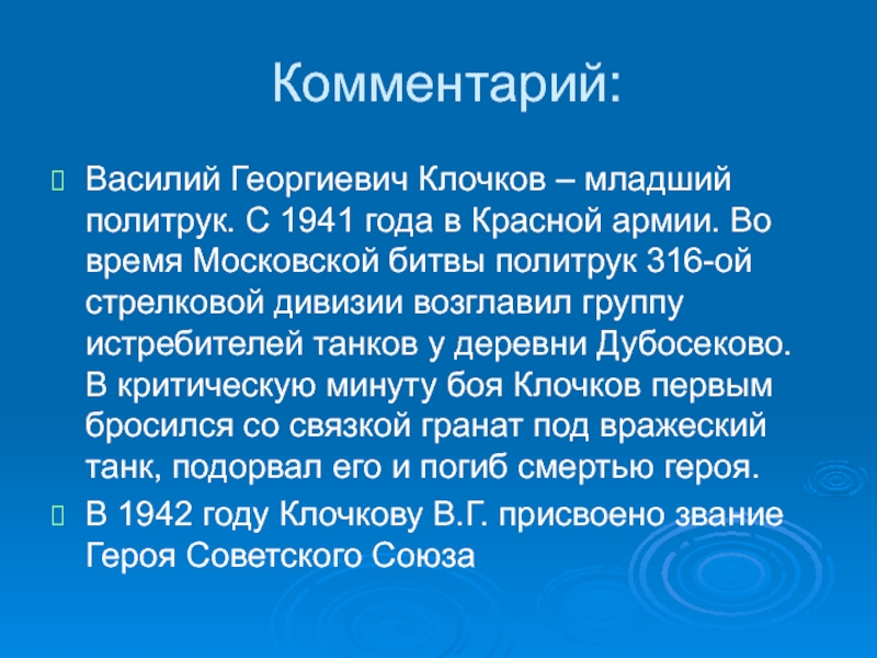 дивизии возглавил группу истребителей танков у деревни Дубосеково. В критическую минуту боя Клочков первым бросился со связкой гранат под вражеский танк, подорвал его и погиб смертью героя.