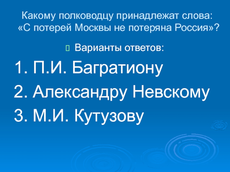 Слайд 22Какому полководцу принадлежат слова: «С потерей Москвы не потеряна Россия»?