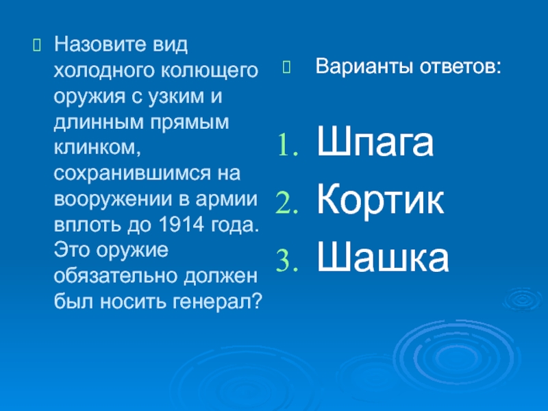 Слайд 24Назовите вид холодного колющего оружия с узким и длинным прямым