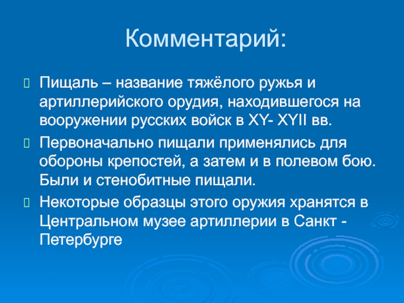 Пищаль – название тяжёлого ружья и артиллерийского орудия, находившегося
