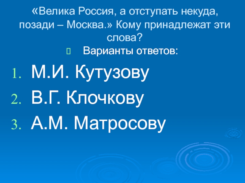 Слайд 30«Велика Россия, а отступать некуда, позади – Москва.» Кому принадлежат
