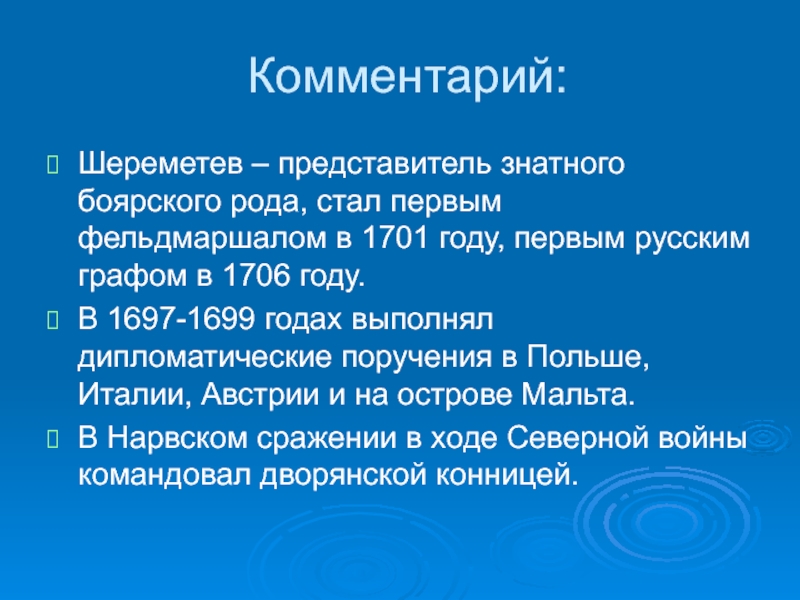 Шереметев – представитель знатного боярского рода, стал первым фельдмаршалом в