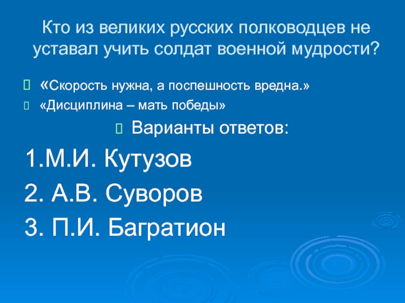 Слайд 20Кто из великих русских полководцев не уставал учить солдат военной