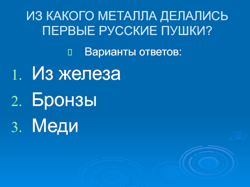Слайд 8ИЗ КАКОГО МЕТАЛЛА ДЕЛАЛИСЬ ПЕРВЫЕ РУССКИЕ ПУШКИ?