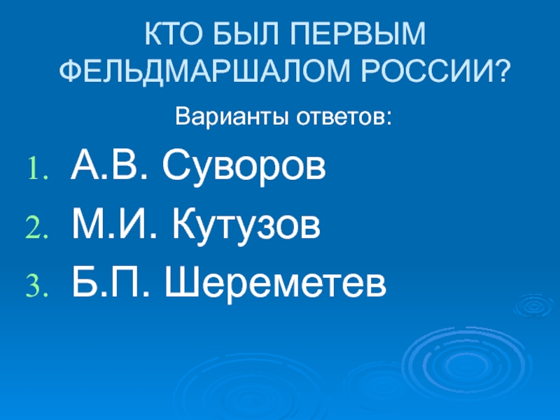 Слайд 5КТО БЫЛ ПЕРВЫМ ФЕЛЬДМАРШАЛОМ РОССИИ?