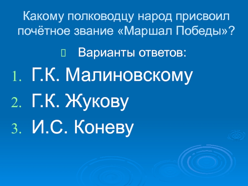 Слайд 36Какому полководцу народ присвоил почётное звание «Маршал Победы»?
