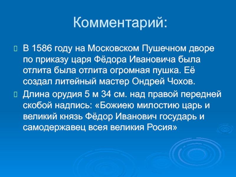 Длина орудия 5 м 34 см. над правой передней скобой надпись: «Божиею милостию царь и великий князь Фёдор Иванович государь и самодержавец всея великия Росия»