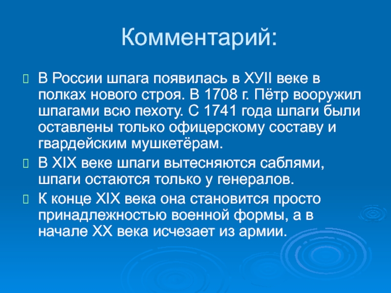 В ХIХ веке шпаги вытесняются саблями, шпаги остаются только у генералов.