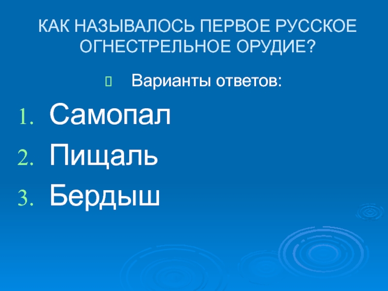 Слайд 11КАК НАЗЫВАЛОСЬ ПЕРВОЕ РУССКОЕ ОГНЕСТРЕЛЬНОЕ ОРУДИЕ?