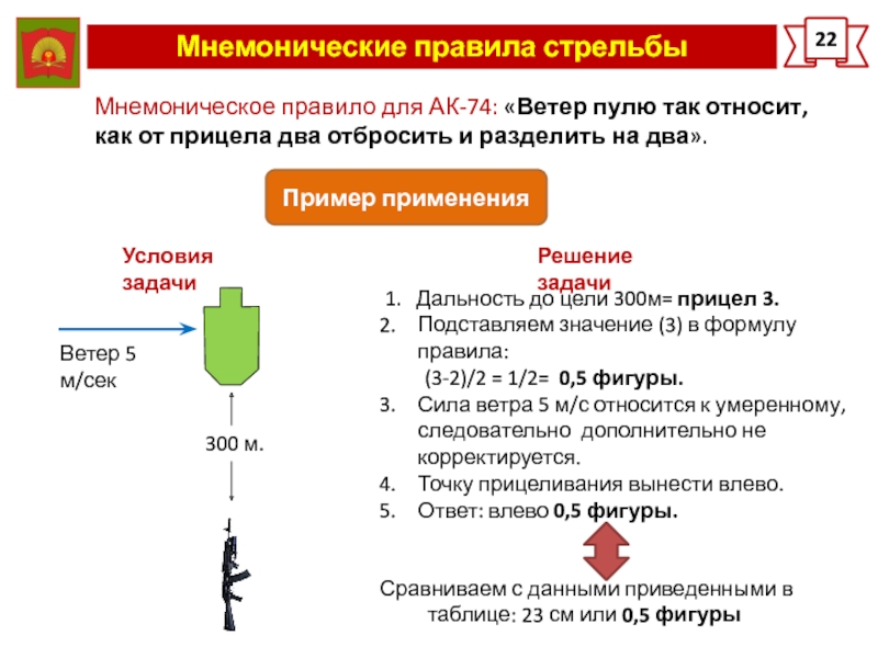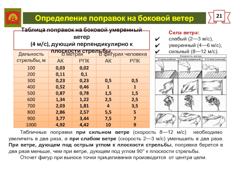 Табличные поправки при сильном ветре (скорость 8—12 м/с) необходимо увеличить в два раза, а при слабом ветре (скорость 2—3 м/с) уменьшить в два раза. При ветре, дующем под острым углом к плоскости стрельбы, поправка берется в два раза меньше, чем при ветре, дующем под углом 90° к плоскости стрельбы.