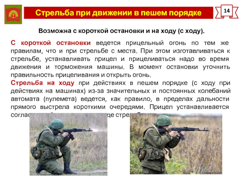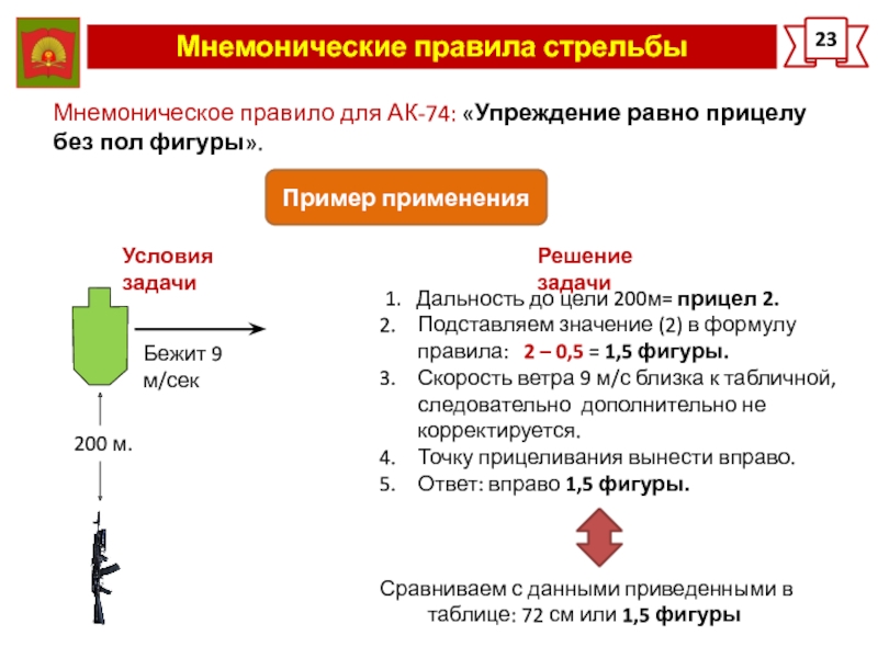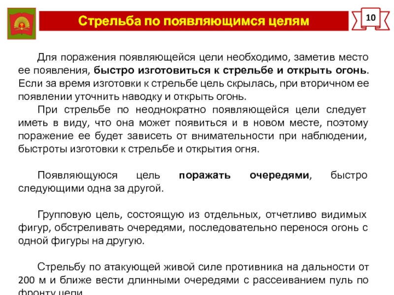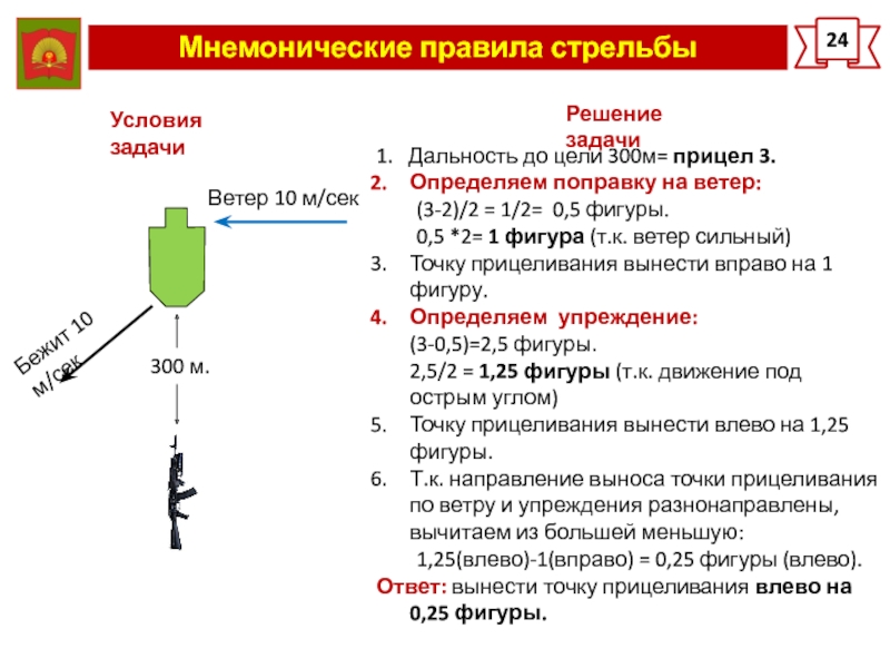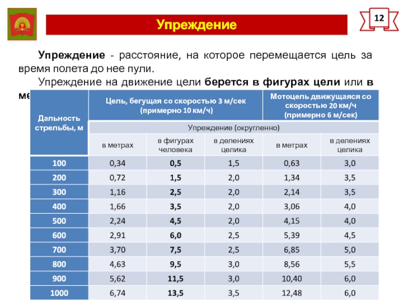 При стрельбе по цели, движущейся под углом к направлению стрельбы, точку прицеливания необходимо выбирать впереди цели и на таком расстоянии от нее, чтобы за время полета пули цель продвинулась на это расстояние.